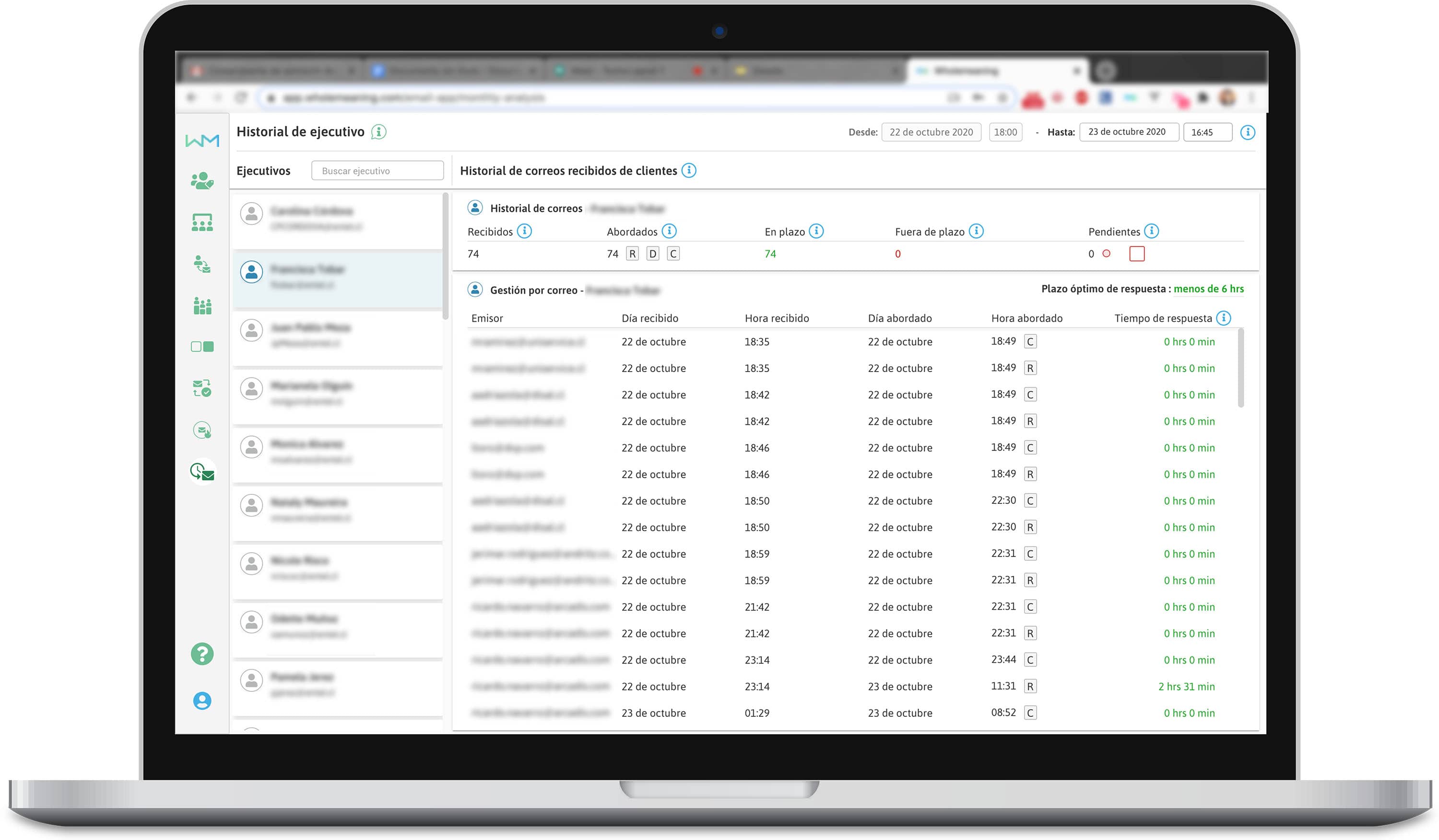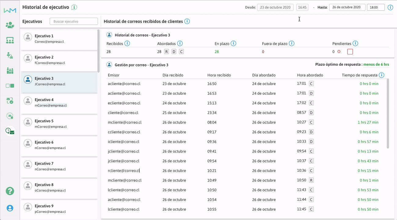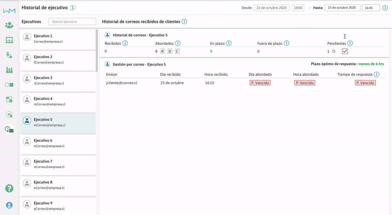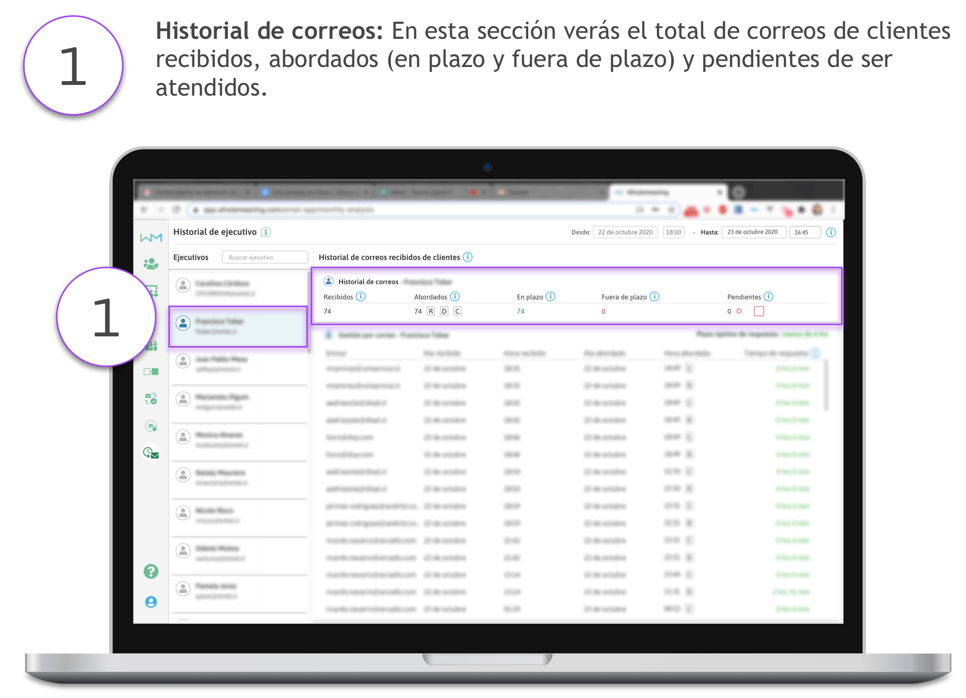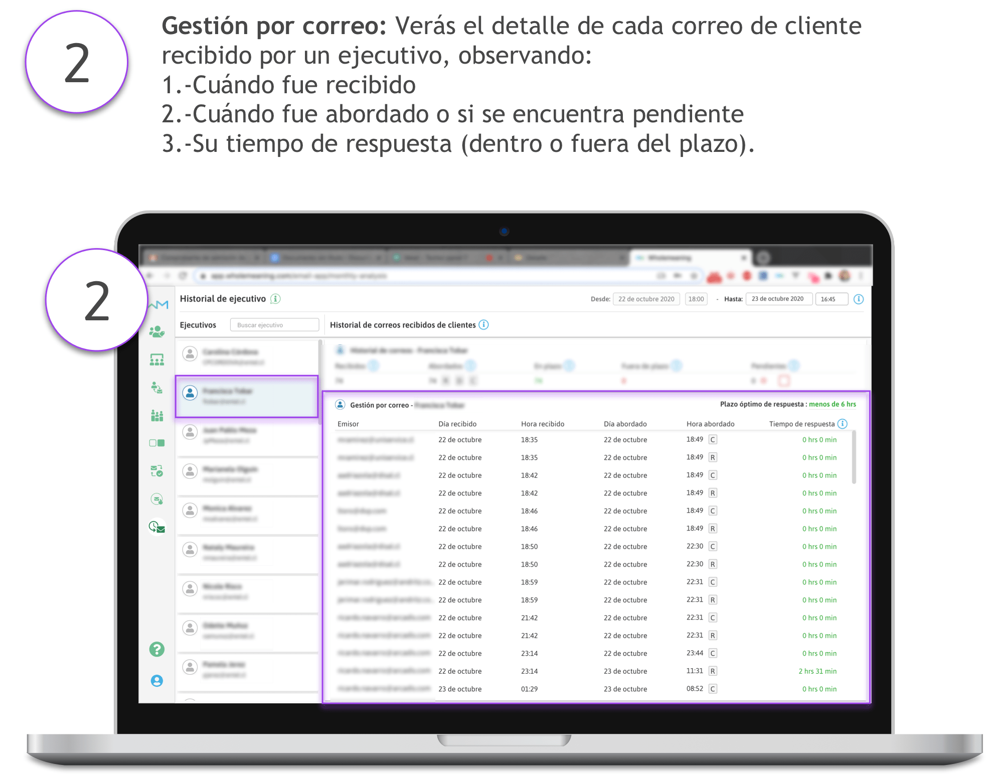 Con este panel podrás tener información detallada acerca de la gestión de correos de clientes de cada miembro de tu equipo.
