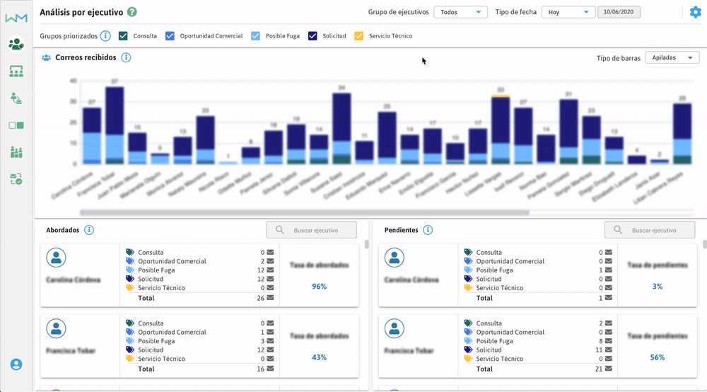 Cuentas con un menú que te permitirá: manejar la tipología de prioridad del caso, buscar a una persona en particular, ordenar las métricas en sentido ascendente / descendente y comparar ejecutivos.