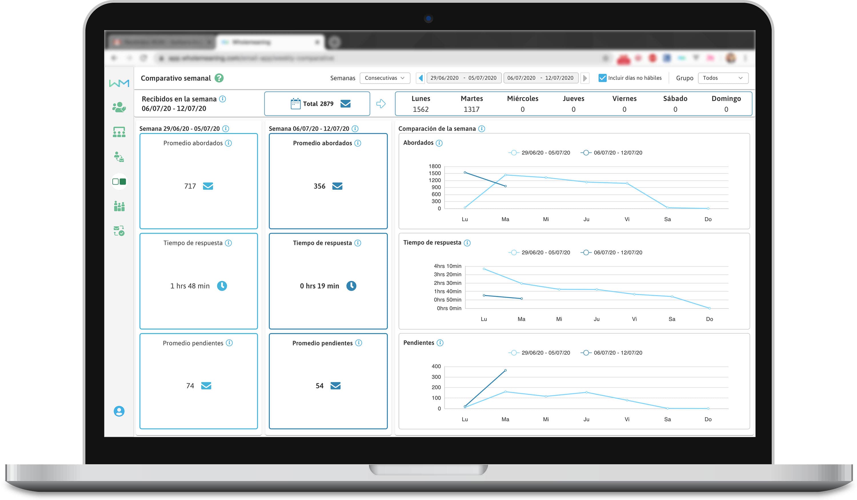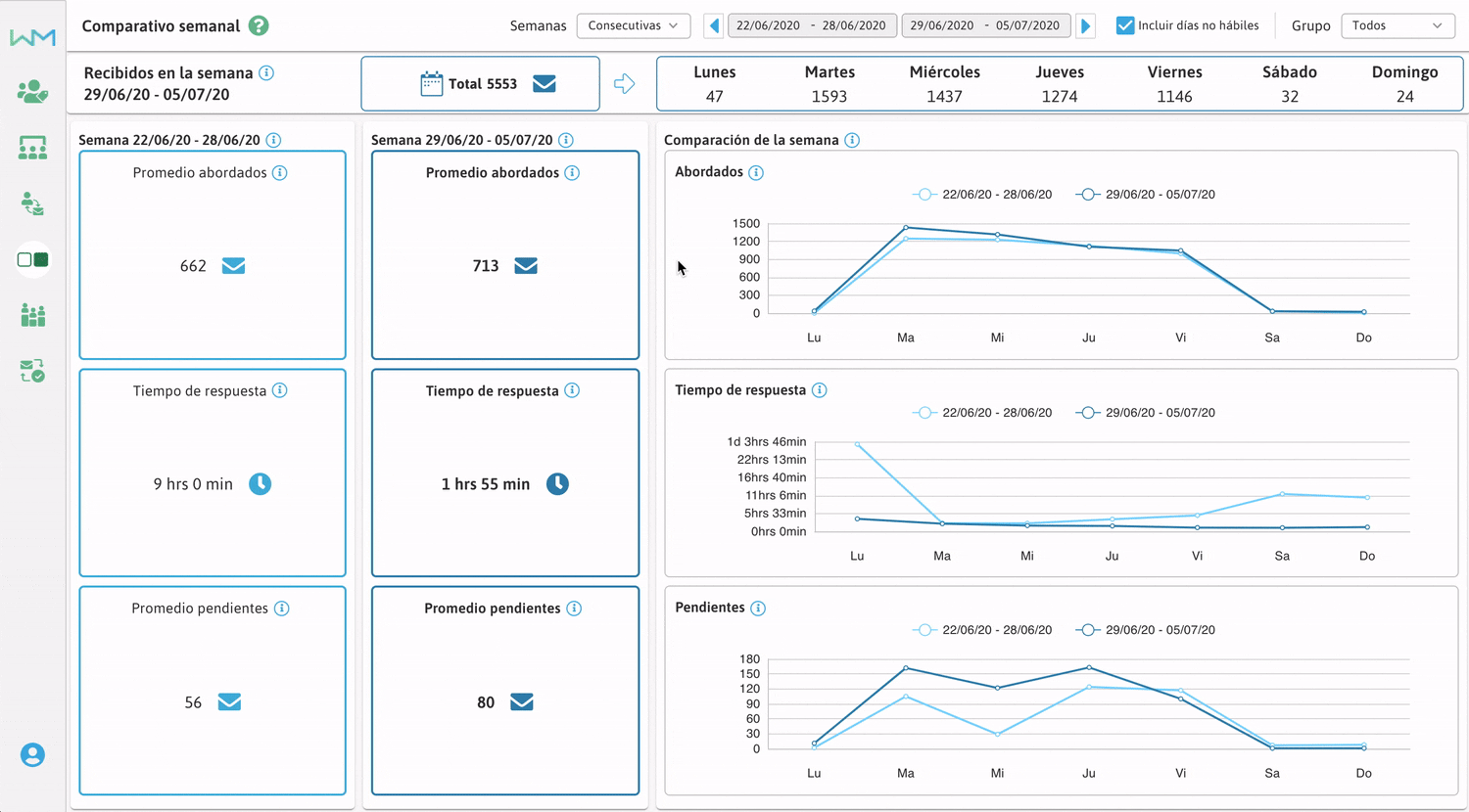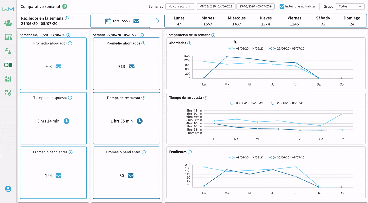 Este panel te permite evaluar la gestión de tu equipo. Verás el flujo de la atención de correos de clientes para cada día de la semana, además de observar tendencias al hacer comparaciones entre semanas.
